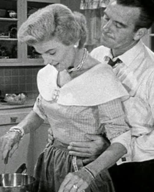 Hugh Beaumont and Barbara Billingsley kiss in a publicity still for the TV show “Leave It To Beaver”, which which they play Ward and June Cleaver.